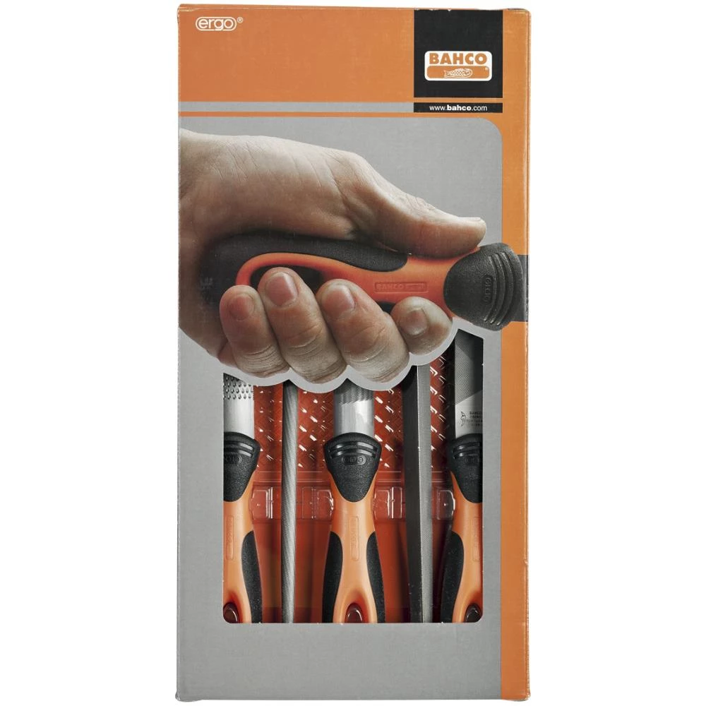 Filehæfte udviklet i henhold til Bahcos ERGO program. Værkstedsfile i sæt, til alment værksteds- og servicearbejde. Til filing af konkave og plane flader, samt afgratning. Til filing af huller, hulkiler, halvrunde noter og konkave flader. Stor afvirkning. Filesæt med 5 stk. file med hæfte. Leveres i papæske inkl. praktisk plastmappe, som beskytter filene. Indeholder 1 stk. af hver af typerne: ansats hugning 1, ansats hugning 2 samt firkant, halvrund og rund i hugning 1.