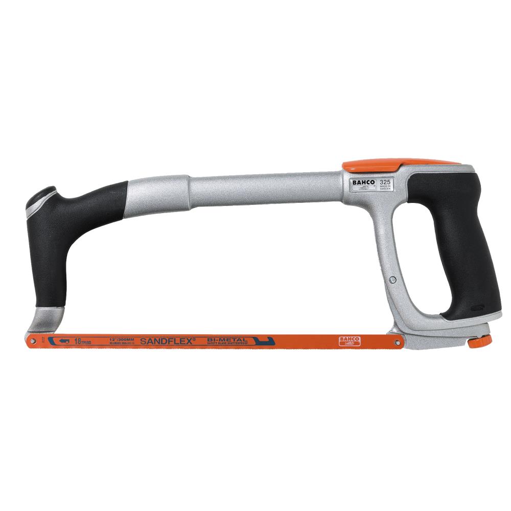 Professionel nedstrygerbue med komfortabelt gummibeklædt håndtag med tommelfingerplacering, som sikrer et solidt greb. Tillader meget store klingespændinger på op til 140 kg, hvilket giver et helt lige snit og skæring af nøjagtige kurver. Klingen er centreret på buen for fuldstændig balance når der saves. Fjederbelastet klingeopspænding giver hurtigt klingeskift og opspænding. Klingen kan opspændes i en vinkel på 55°. Leveres med Sandflex bimetalklinge 24 tpi.