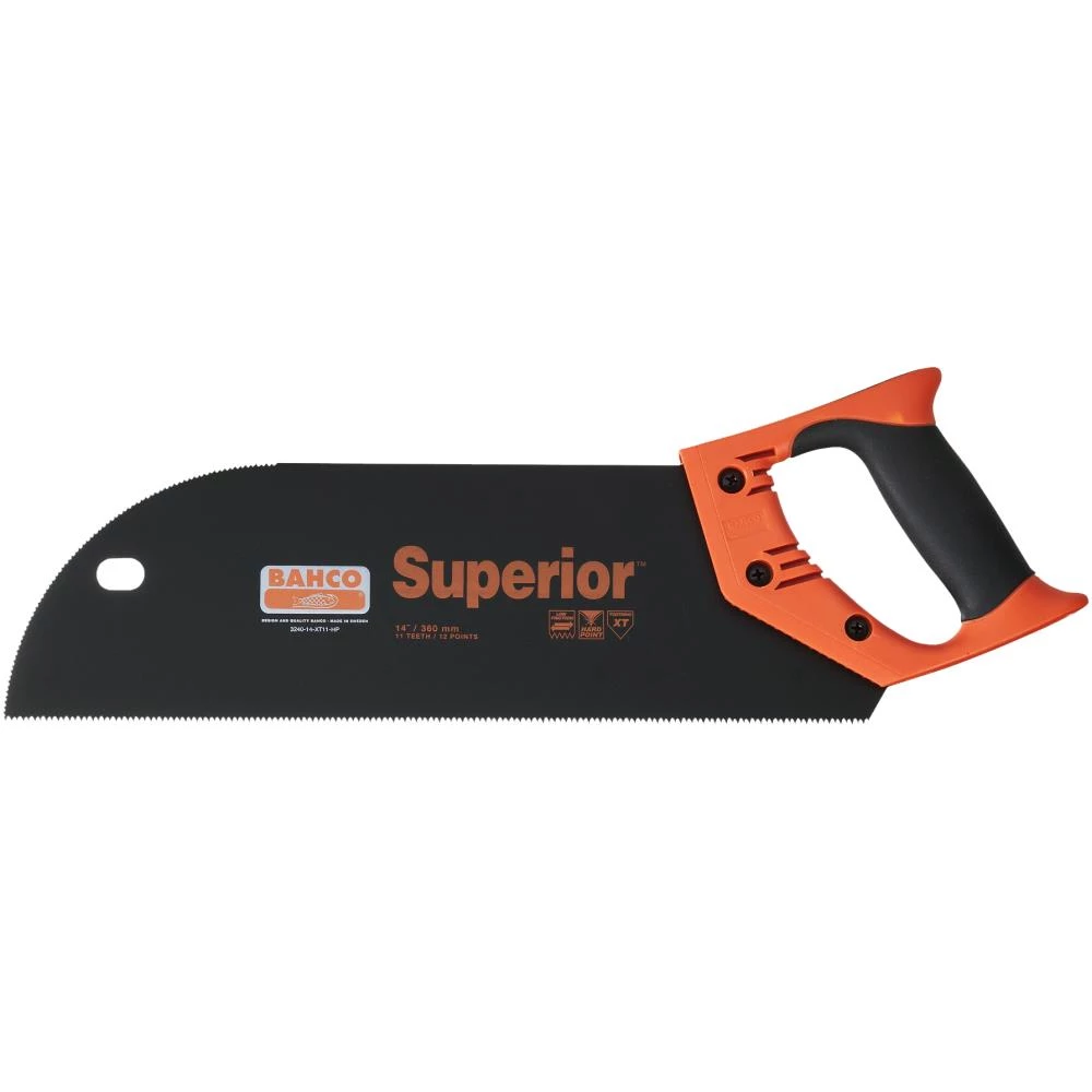 Håndsav, udviklet i henhold til Bahcos ERGO program. Professionel sav til fint snedkerarbejde. Stabil klinge for fine og rette snit. XT-fortanding, som giver overlegen skæreegenskab. Buet front med fortanding for udsavning af spor midt på en plade. Overfladebehandlet klinge, som mindsker friktionen og beskytter mod rust. 11 tænder pr. tomme. Ergonomisk to-komponents vinkelhåndtag med 45° og 90°. Håndtaget er monteret med skruer.