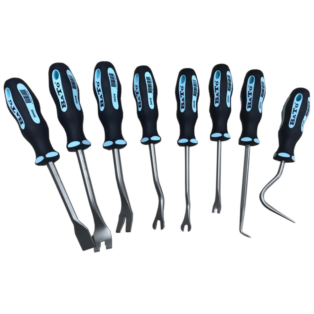 Værktøjssæt med 8 dele: løsne/udtrækker/clips-værktøj. Vinkeludriver stor 80 mm, vinkeludriver lille 125 mm, løsne/udtrækker lille konisk 6×100 mm, løsne/udtrækker stor konisk 9,5×110 mm, løsne/udtrækker stor 2-delt 9,5×134 mm, løsne/udtrækker lille bue 6,2×115 mm, løsne/udtækker stor bue 10,0×115 mm samt pakningsskraber bred 22,3×125 mm.