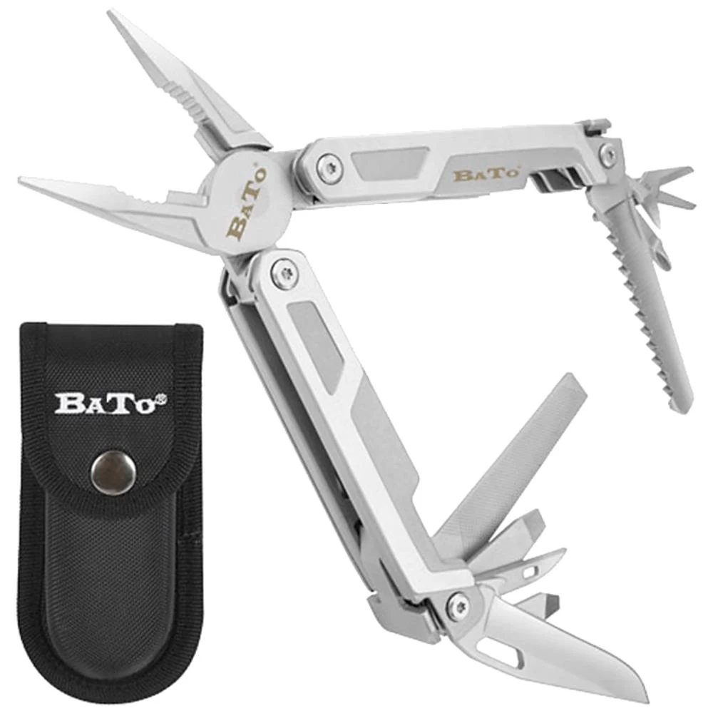 Multitool i rustfrit stål med hele 15 forskellige funktioner: kombitang – spidstang – wireklipper – fil – oplukker – lille kærvskruetrækker – stor kærvskruetrækker – kniv – syl – saks – dåseåbner – snorhul – skarp kniv – PH-skruetrækker – grovsav. Leveres med bælteholder.