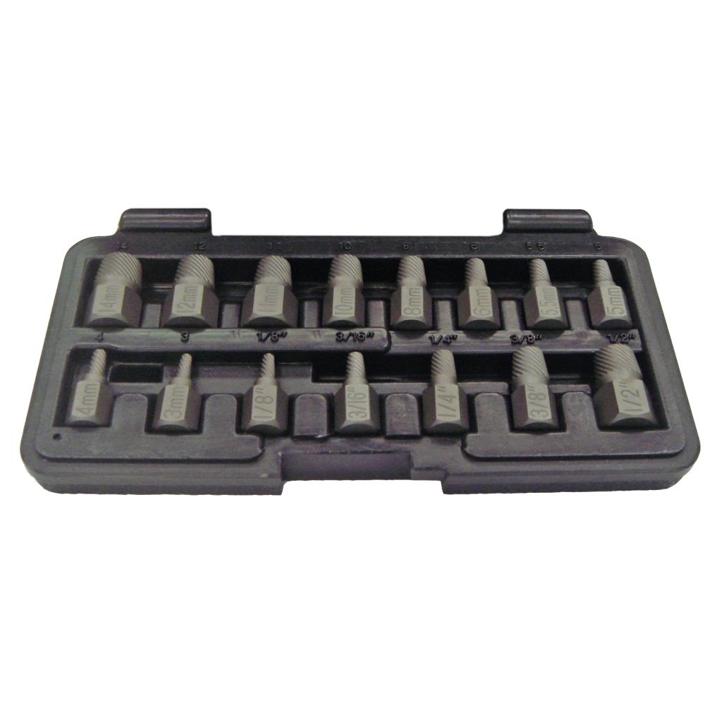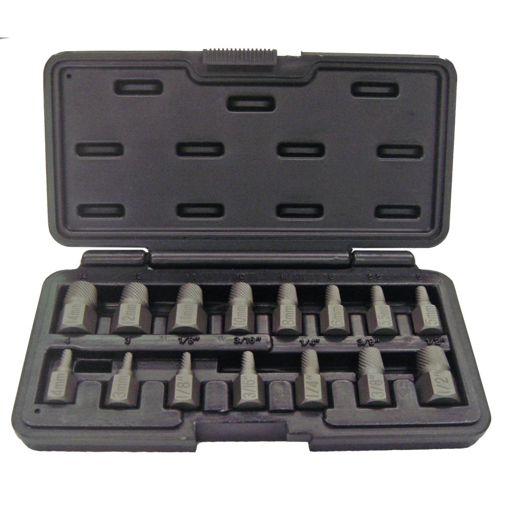 Skrueudtrækkersæt med 15 dele. Indeholder: M3 – M4 – M5 – M5,5 – M6 – M8 – M10 – M11 – M12 – M14 mm og 1/8″, 3/16″, 1/4″, 3/8″ og 1/2″. Leveres i plastkuffert.