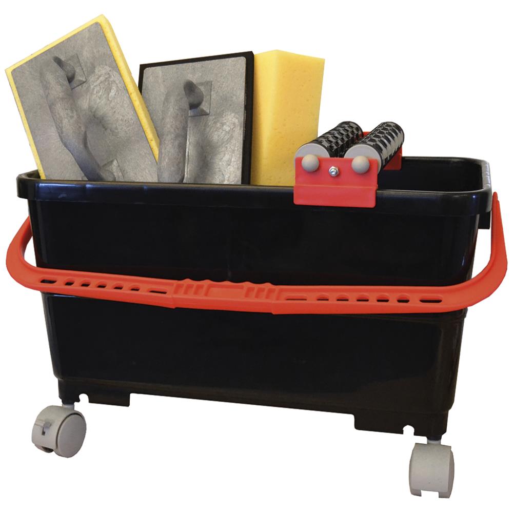 Flisevaskesæt med 24 ltr. rullespand med hjul, 2 åbne ruller samt opskåret hydrobræt, fugebræt/fliselemmer og murersvamp.