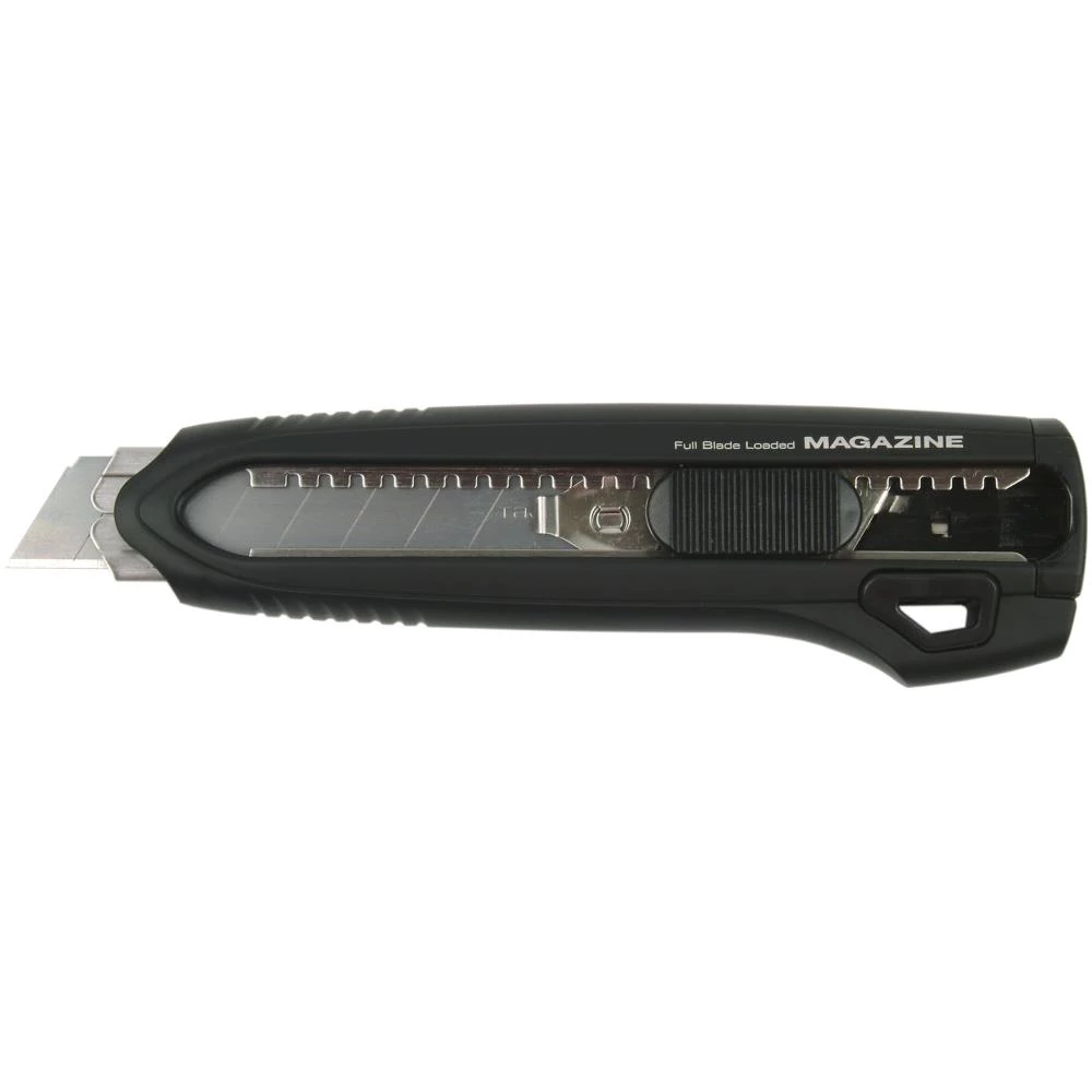 Tajima LC-ML500 reloader kniv. Holder 6 blade i alt. Låsen føres helt frem, bladet tages ud, og et nyt blad kommer automatisk op fra magasinet. Udførsel i aluminium betrukket med gummi gør den særdeles let og giver et fremragende greb.