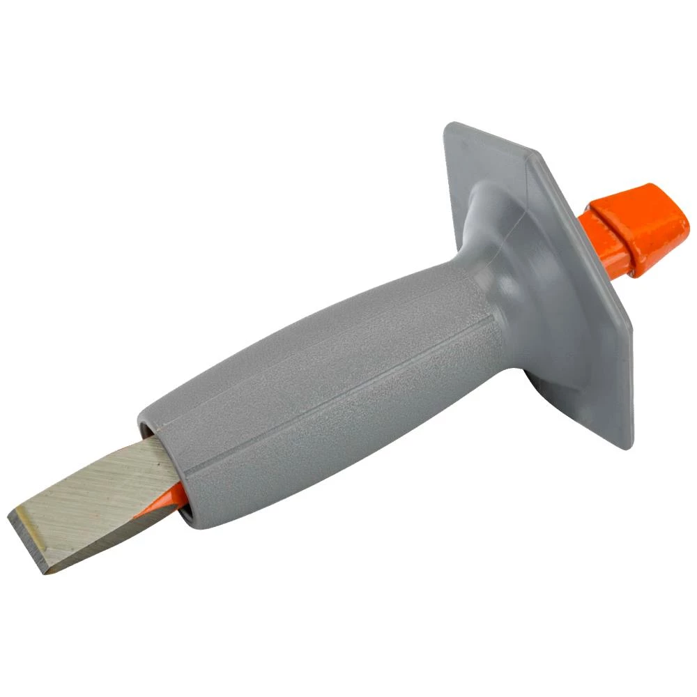 Genopslibelig fladmejsel med fladt skaft og håndbeskytter 8741. Smedet slagflade. Langt fladt skaft. Kromstål. Kan slibes. Med plasthåndbeskytter.