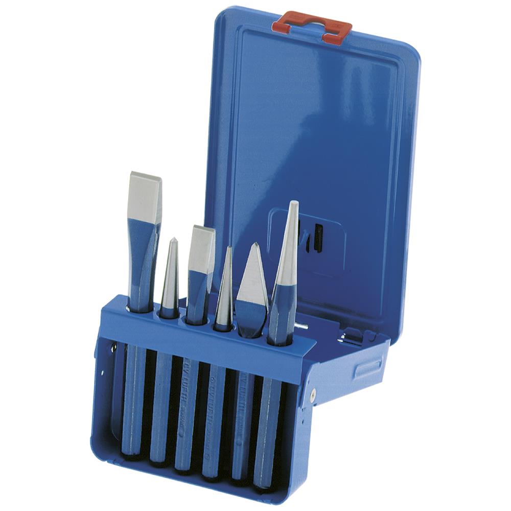 Mejsel-, dorn- og kørnersæt med 6 dele. Indhold: 2 flade mejsler hhv. 125×12×10 mm og 150×16×12 mm, 2 dorne hhv. 150×12×4 mm og 120×10×2 mm, 1 krydsmejsel 125×10 mm samt 1 kørner 120×10 mm. Leveres i metalæske.