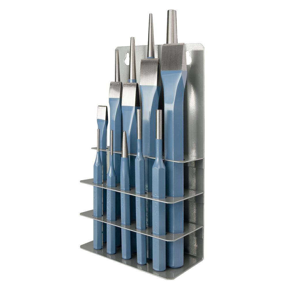 Mejsel, kørner, splituddriver og dornsæt i Chrom-Vanadium-stål med polerede spidser. Leveres inklusive kraftig metalstander som kan stå eller hænge. Indeholder 1×kørner: 3×125 mm, 4×splituddriver: 2 / 3 / 5 / 6 mm, 4×dorn: 3×215 + 3×250 / 4×225 / 10×250 mm og 5×fladmejsel: 13×150 / 16×175 mm.
