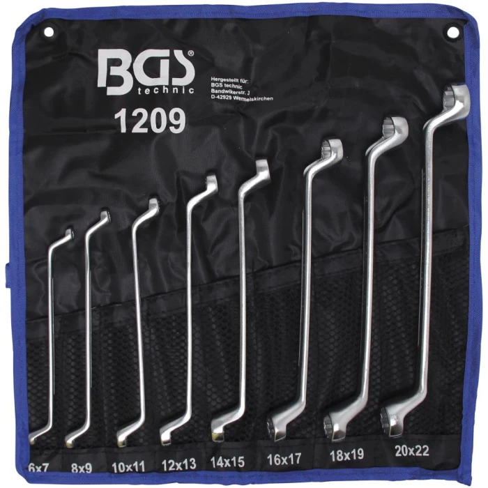 BGS dobbelt ringnøglesæt med 8 dele: 6×7, 8×9, 10×11, 12×13, 14×15, 16×17, 18×19 og 20×22 mm.