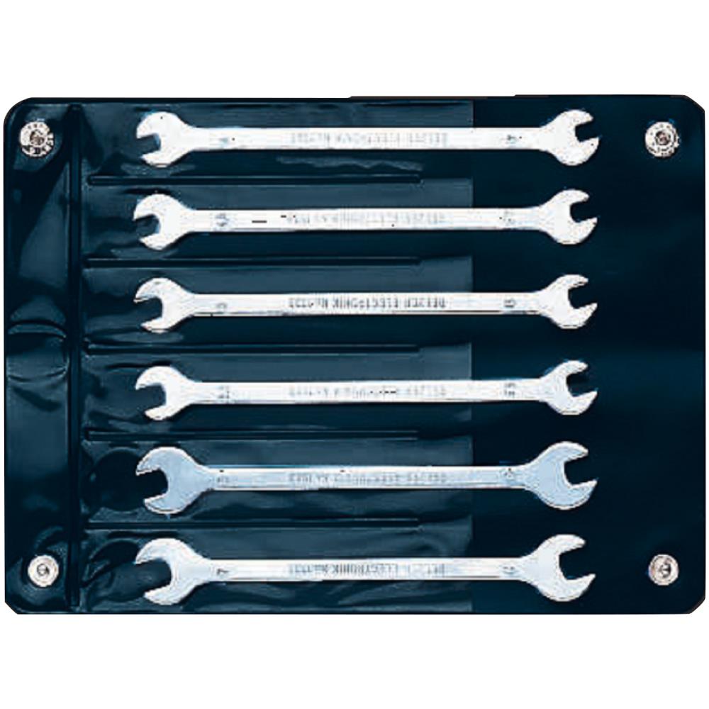 Gaffelnøglesæt 1933M elekt. 6 dele. Gaffelnøglesæt med 6 dele leveret i rullemappe. Dobbelt gaffelnøgle med 15° gaffelvinkel – en ende med 10° vinkelforsætning – og ens metrisk dimension i hver ende. Ekstra lang og slank type, som er ideel til elektronikbranchen, finmekanik, telekommunikation mv. Fremstillet af højtlegeret stål med mikro-matforkromet finish. DIN 934 standard. Sættet indeholder dimensionerne: 4/4,5/5/5,5/6/7 mm.