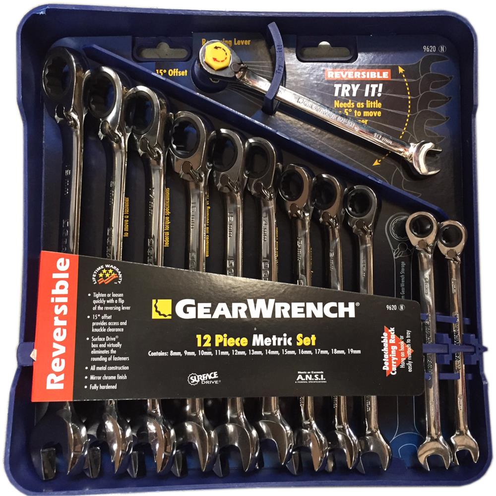 Ringskraldenøglesæt med 12 dele. Metriske nøgler med samme dimension i hver ende. 15° vinkling og omskifter. Sættet indeholder størrelserne 8, 9, 10, 11, 12, 13, 14, 15, 16, 17, 18 og 19 mm.