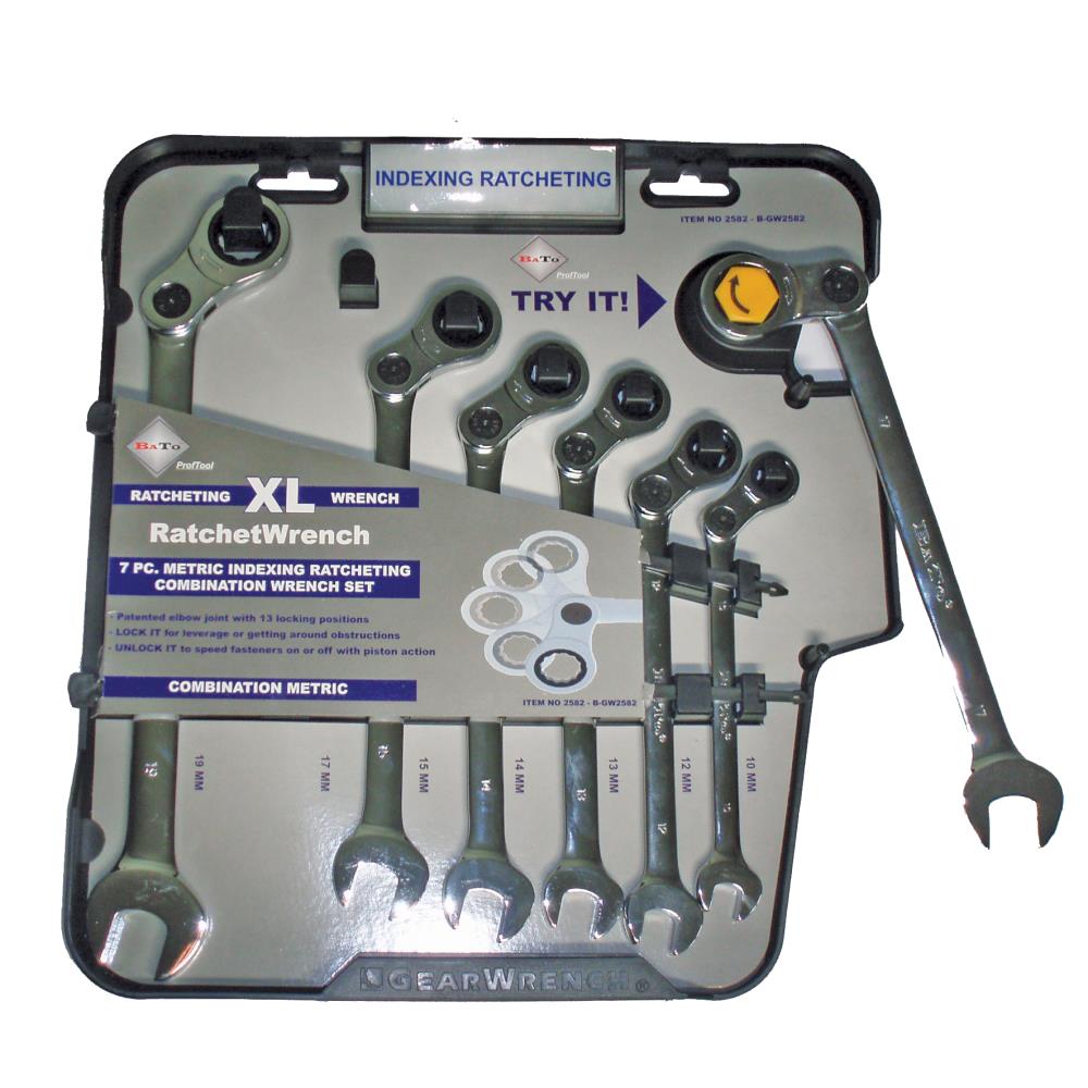 Index ringskraldenøglesæt med 7 dele. Nøgler med samme metriske dimension i hver ende samt index med vippefunktion og lås. Sættet indeholder størrelserne 10, 12, 13, 14, 15, 17 og 19 mm.