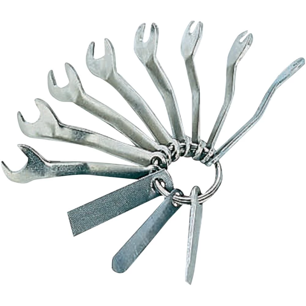 Magnet-gaffelnøglesæt med 8 dele. Højtlegeret stål, mikro-matforkromet finish. Indhold: 4,0 – 4,5 – 5,0 – 5,5 – 6,0 – 6,5 – 7,0 og 7,5 mm, magnetfil, følelære og skruetrækker. Leveres på ring.