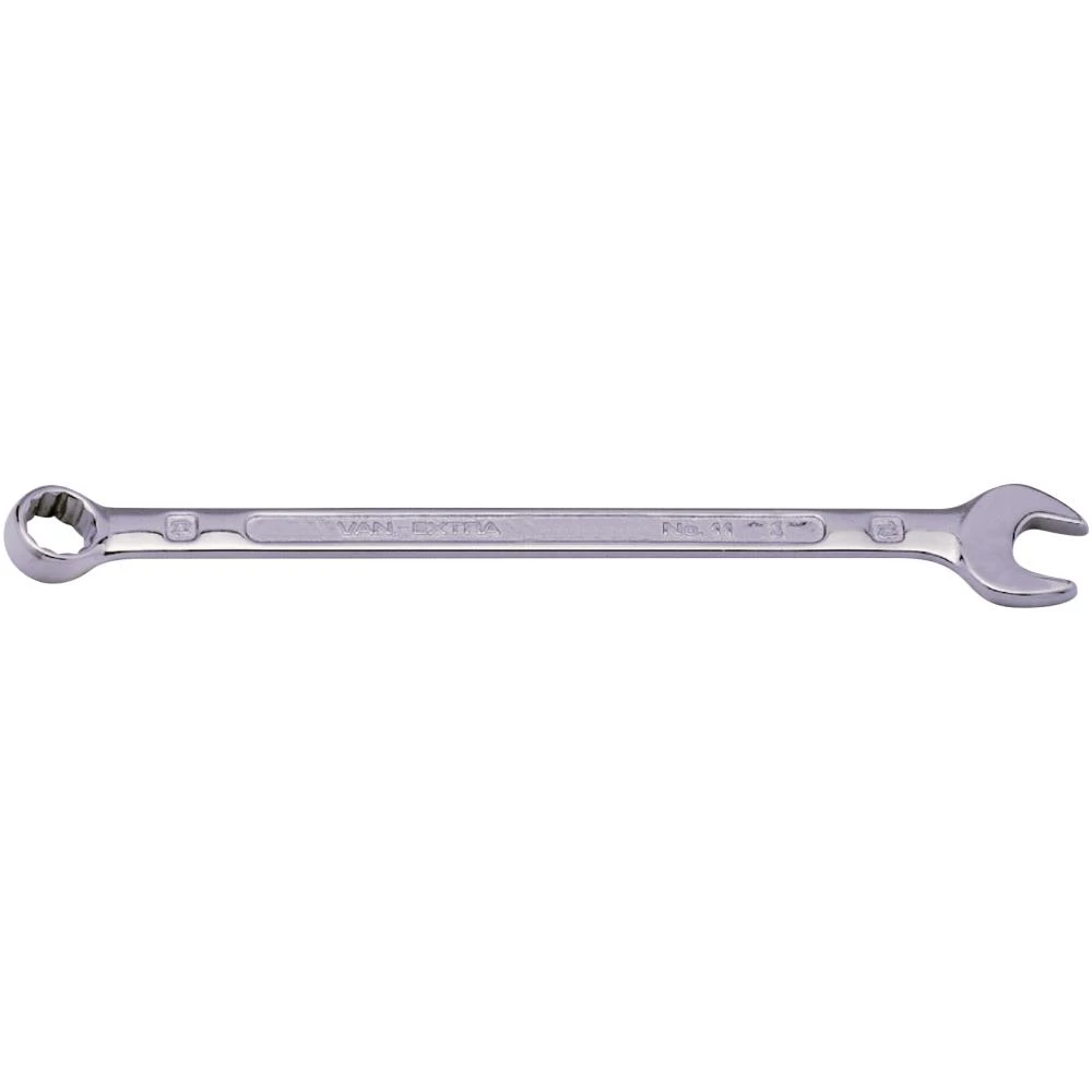 Ring-gaffelnøgle, lang model, metrisk. ISO 691, ISO 7738, ISO 3318, ISO 1711-1 og DIN 3113. Højtlegeret stål. Gaffelvinkel 15°, slankt hoved til brug hvor pladsen er trang. Ring-ende med en vinkelforsætning på 15°, for bedre beskyttelse af knoer. Ring med indvendig 12kt. Dynamic Drive profil, sikrer deformering af bolte og møtrikker. Matforkromet. Fås i flere dimensioner.