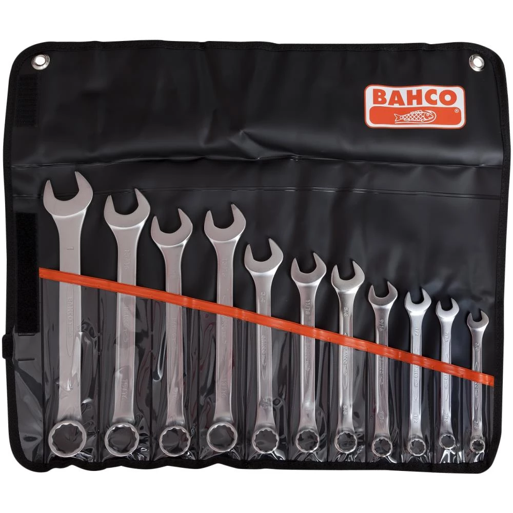 Ring-/gaffelnøglesæt med 11 dele i plastmappe. Nøgler med samme tomme-dimension i hver ende. 15° gaffelvinkel med slankt hoved til brug hvor pladsen er trang. Ring med 15° vinkelforsætning og indv. 12kt Dynamic Drive-profil mod deformering af bolte og møtrikker. U-formet greb for bedre komfort. Fremstillet af højtlegeret stål og matforkromet. Tydelig dimensionsangivelse på nøglen. ISO 691, ISO 7738, ISO 3318, ISO 1711-1 og DIN 3113. Sættet indeholder: 3/8″ – 7/16″ – 1/2″ – 9/16″ – 5/8″ – 11/16″ – 3/4″ – 13/16″ – 7/8″ – 15/16″ – 1″.