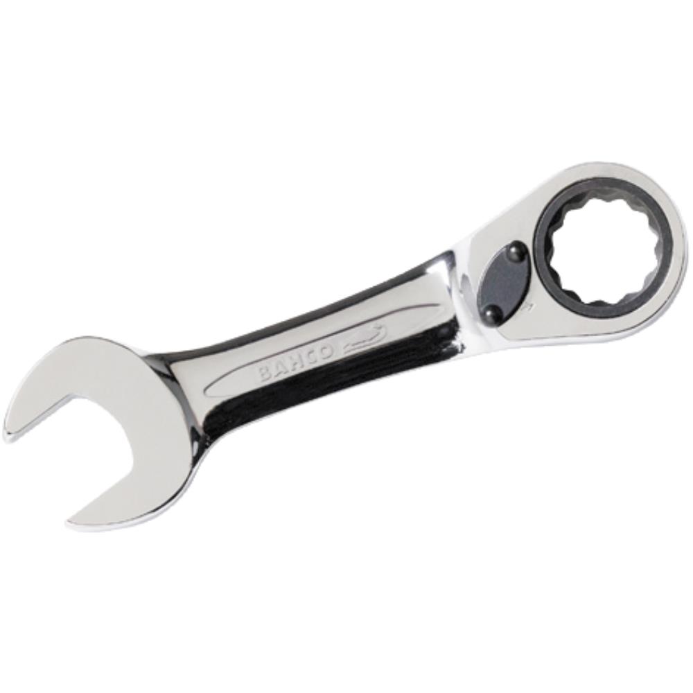 Ring-skraldenøgle “Stubby”, metrisk, kort type. Overholder ISO 3318 og 3113. Højtlegeret stål. 15° vinklet hoved. Skraldefunktion i ringen. Ring med indv. 12kt. Dynamic Drive profil, sikrer deformering af bolte og møtrikker. 5° arbejdsvinkel. Forsynet omskifter for hurtig ændring af højre og venstre omløb. Micro matforkromet. Fås i flere dimensioner.