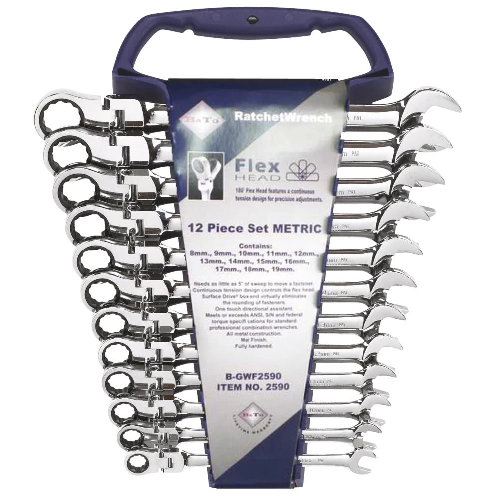 Ring-/skraldenøglesæt med 12 dele i holder med bærehåndtag. Metriske nøgler med samme dimension i hver ende. Flexled-skraldehoved med 72 td skraldefunktion. Fremstillet af Krom-vanadiumstål, poleret. Indeholder: 8 – 9 – 10 – 11 – 12 – 13 – 14 – 15 – 16 – 17 – 18 – 19 mm.