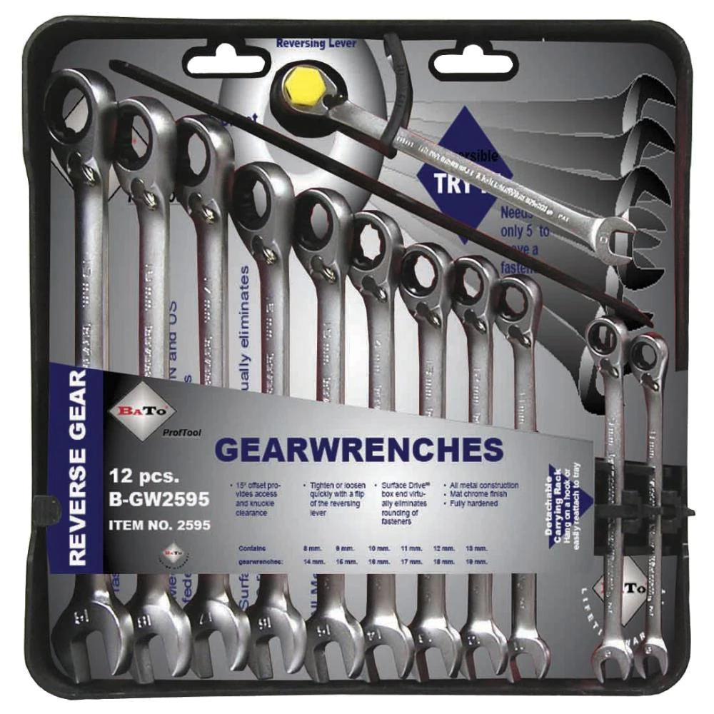 Ringskraldenøglesæt med 12 dele. Nøgler med omskifter og 15° vinkling. Sættet indeholder flg. dimensioner: 8 – 9 – 10 – 11 – 12 – 13 – 14 – 15 – 16 – 17 – 18 – 19 mm.