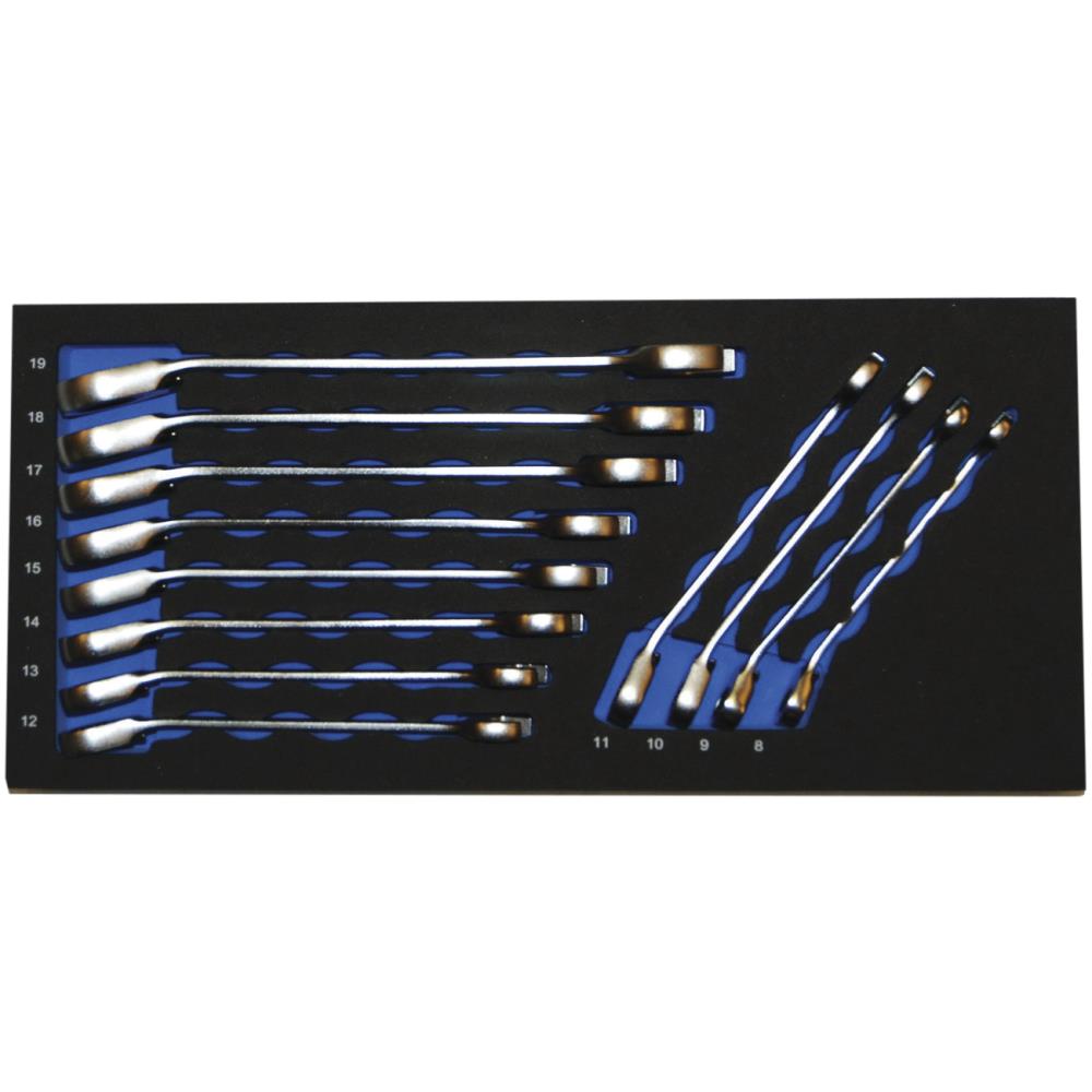Ringskraldenøglesæt med 12 dele i EVA-skumindlæg klar til værktøjsvognsskuffe. Sættet indeholder metriske ringskraldenøgler i størrelserne 8-9-10-11-12-13-14-15-16-17-18 og 19 mm. Skumindlægget fylder 1/3 skuffe i Bato værktøjsvogn.
