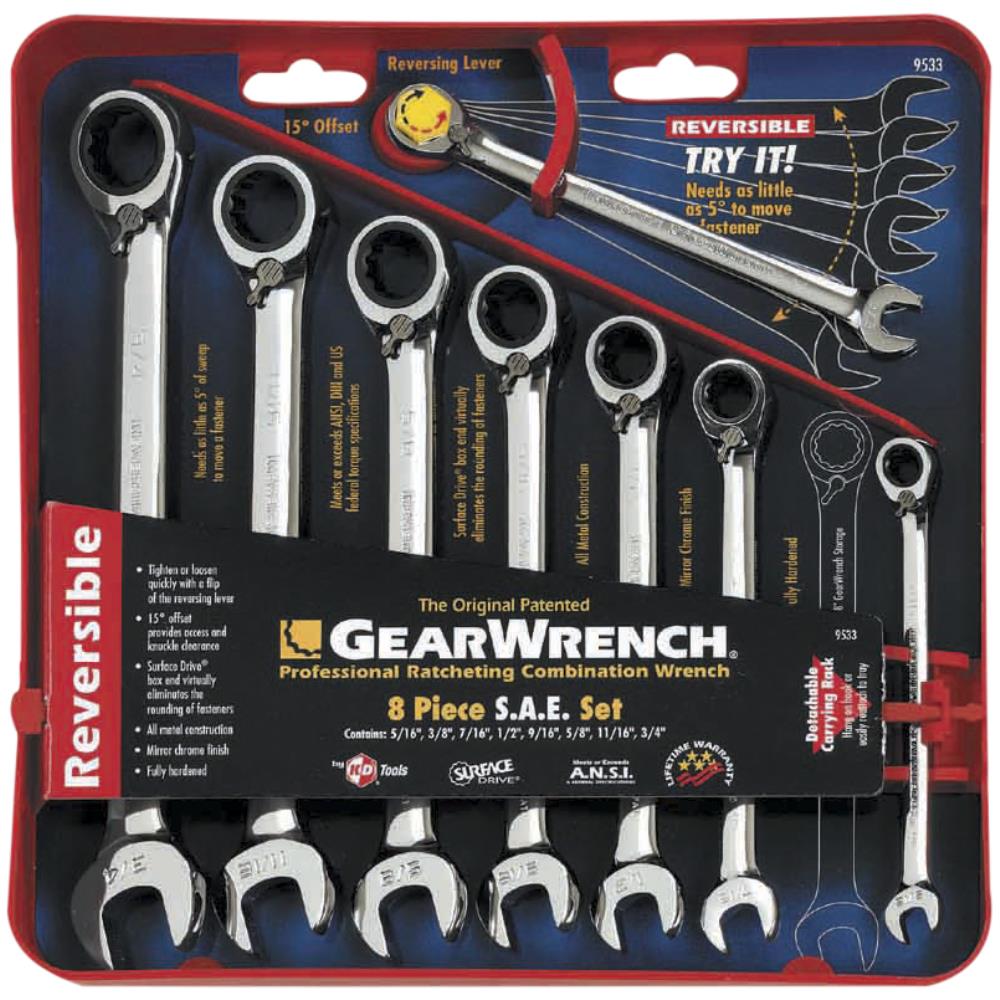 Ringskraldenøglesæt med 8 dele. Nøgler med samme tomme dimension i hver ende samt 15° vinkling og omskifter. Sættet indeholder størrelserne 5/16, 3/8, 7/16, 1/2, 9/16, 5/8, 11/16 og 3/4″.