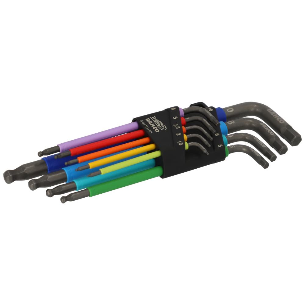 Stiftnøglesæt med 9 metriske, farvede, lange nøgler med kugle: 1,5 – 2 – 2,5 – 3 – 4 – 5 – 6 – 8 – 10 mm. De forskellige farver giver hurtig identifikation af den rigtige nøgle. Lasermarkering af størrelse for hurtig adgang til hver størrelse. Kuglen muliggør arbejde fra flere vinkler, også hvor pladsen er trang. Nøglerne har easy fit-funktion for sikker fastholdelse af nøglerne. Edge plus design med affaset kant giver større overfladekontakt. Sprøjtestøbt greb med soft-touch-fornemmelse giver et behageligt og skridsikkert greb. Højtlegeret stål med fosfateret udførelse beskytter mod korrosion. Praktisk og solid holder med soft-touch fornemmelse.