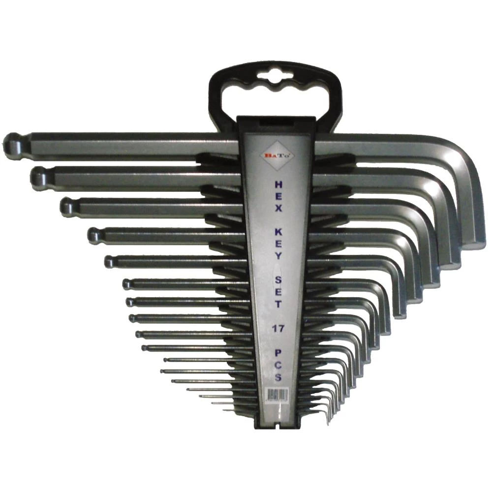 Stiftnøglesæt med 17 dele. Ekstra lange, blanke stiftnøgler med kugle. Sættet indeholder størrelserne 1,3 / 1,5 / 2,0 / 2,5 / 3,0 / 3,5 / 4,0 / 5,0 / 5,5 / 6,0 / 7,0 / 8,0 / 10,0 / 12,0 / 14,0 / 17,0 og 19,0 mm. Leveres i praktisk holder.