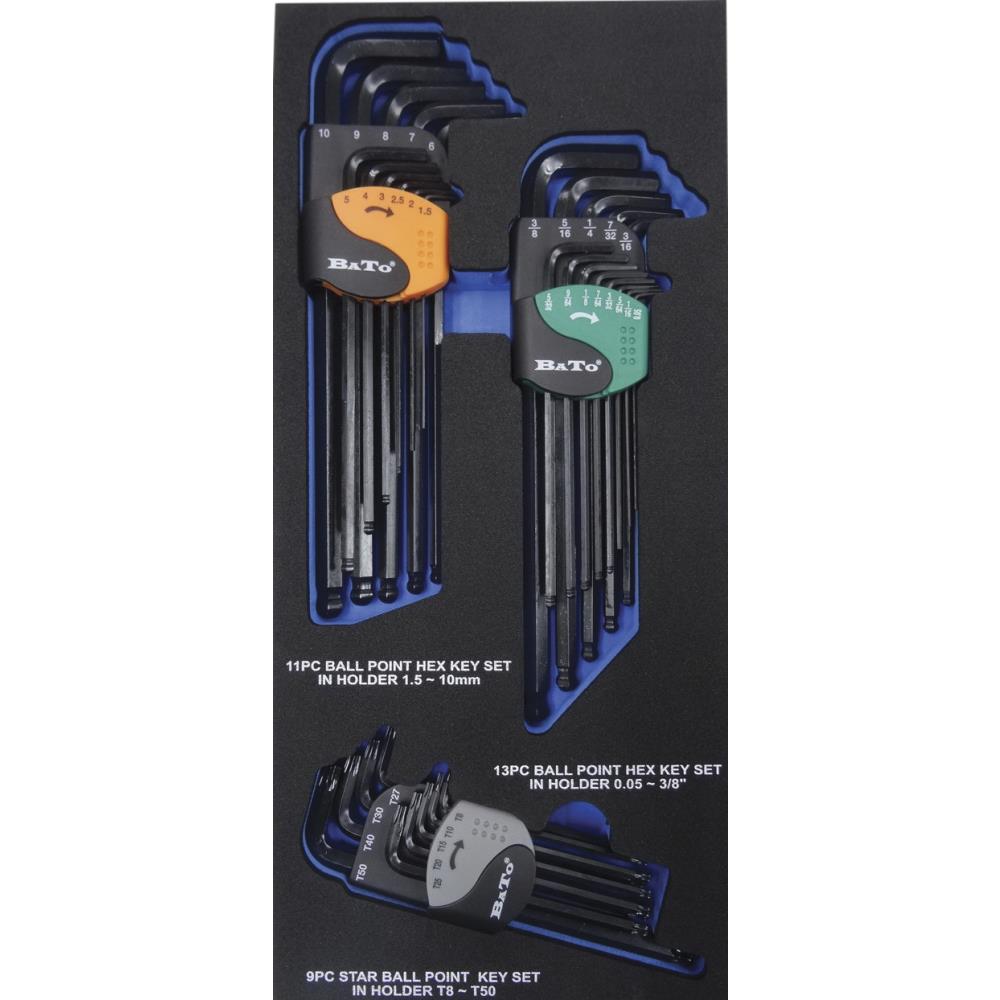 Stiftnøglesæt med 33 dele i EVA-skumindlæg klar til værktøjsvognsskuffe. Stiftnøglesæt i mm 1,5 mm / 2,0 mm / 2,5 mm / 3,0 mm / 4,0 mm / 5,0 mm / 6,0 mm / 7,0 mm / 8,0 mm / 9,0 mm / 10,0 mm. Stiftnøglesæt tommer 0,05 – 1/16 – 5/64 – 3/32 – 7/64 – 1/8 – 9/64 – 5/32 – 3/16 – 7/32 – 1/4 – 5/16 – 3/8″. Torx stiftnøglesæt TX8, TX10, TX15, TX20, TX25, TX27, TX30, TX40, TX50. Skumindlægget fylder 1/3 skuffe i Bato værktøjsvogn.