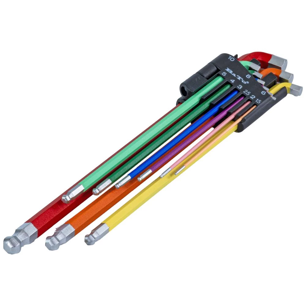Stiftnøglesæt med 9 nøgler med kugleende og stubby-vinkel, som gør dem nemme at anvende ved trængt plads. Praktisk farve til identifikation. Sættet indeholder 1,5 – 2,0 – 2,5 – 3,0 – 4,0 – 5,0 – 6,0 – 8,0 – 10,0 mm.