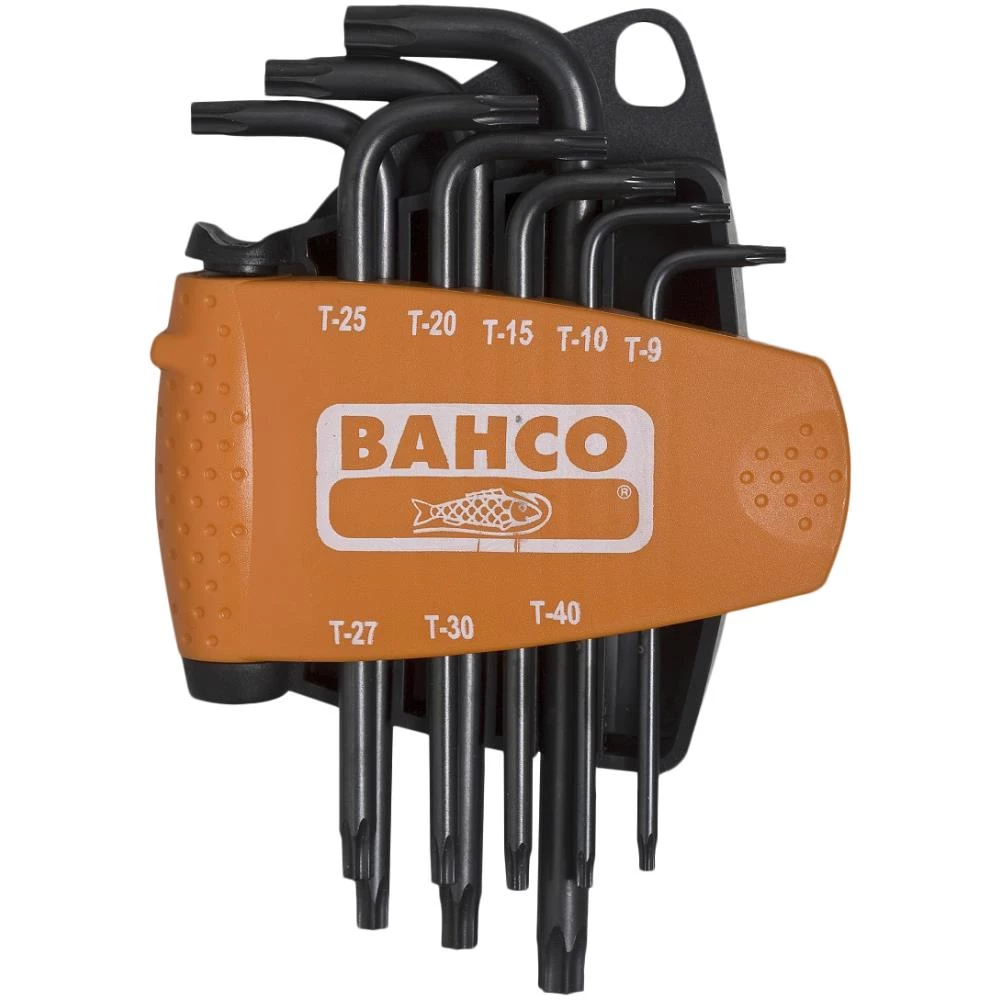 Torx-nøglesæt med 8 dele. Vinklede Torx nøgler i lang udførsel for større moment og til brug hvor pladsen er trang. Dimensionsangivelse stemplet i hver nøgle for hurtig identifikation af størrelse. Fremstillet af fuldt hærdet, højtlegeret stål med sort finish. Leveres i tokomponent holder med let adgang – en variant fås med magnetiseringsboks indbygget i holderen. Sættet indeholder dimensionerne: T9, T10, T15, T20, T25, T27, T30 og T40.