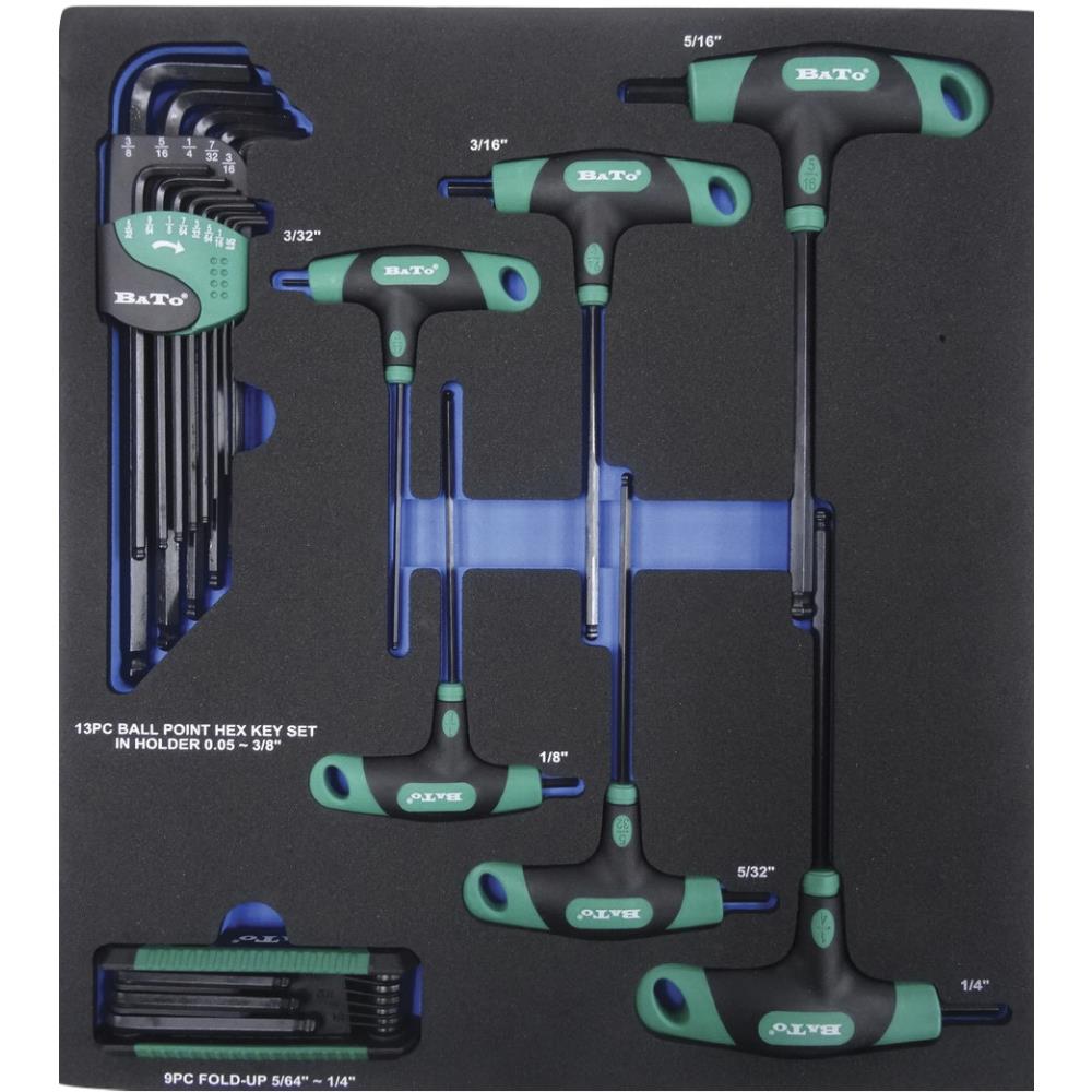 Stiftnøglesæt med 3 værktøjssæt i EVA-skumindlæg klar til værktøjsvognsskuffe. Sættet indeholder tomme-stiftnøglesæt: stiftnøgler med T-greb 3/32 – 1/8 – 5/32 – 3/16 – 1/4 – 5/16″, stiftnøglesæt som knivmodel 5/64 – 3/32 – 7/64 – 1/8 – 9/64 – 5/32 – 3/16 – 7/32 – 1/4″ og stiftnøglesæt i holder 0,05 – 1/16 – 5/64 – 3/32 – 7/64 – 1/8 – 9/64 – 5/32 – 3/16 – 7/32 – 1/4 – 5/16 – 3/8″. Skumindlægget fylder 2/3 skuffe i Bato værktøjsvogn.