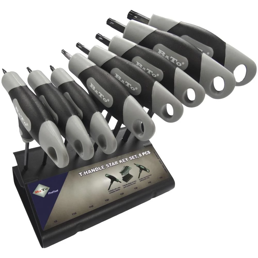 Stiftnøglesæt med 8 dele. T-grebs stiftnøgler med kugle. Sættet indeholder størrelserne TX8, TX10, TX15, TX20, TX25, TX30, TX40 og TX50 og leveres i metalstander.