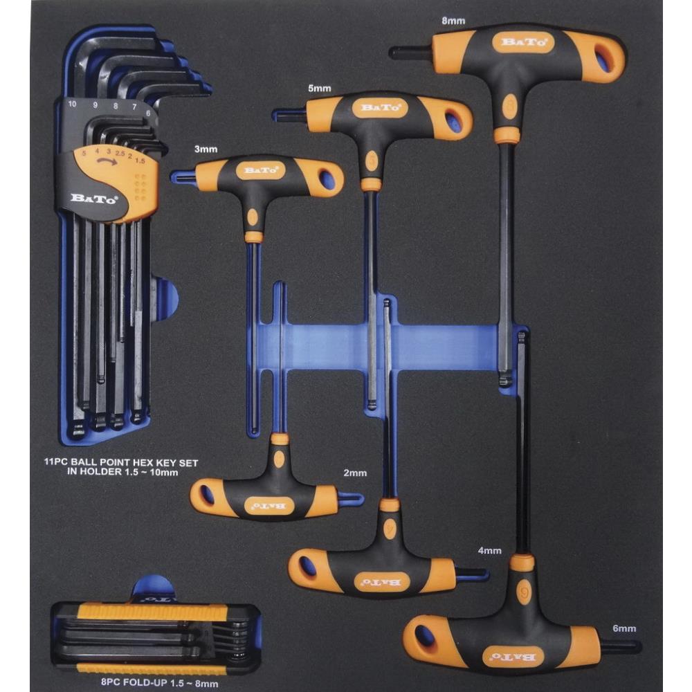 Stiftnøglesæt med 3 værktøjssæt i EVA-skumindlæg klar til værktøjsvognsskuffe. Sættet indeholder metriske stiftnøglesæt: stiftnøgler med T-greb 2,0 – 3,0 – 4,0 – 5,0 – 6,0 – 8,0 mm, stiftnøglesæt som knivmodel 1,5-8 mm og stiftnøglesæt i holder 1,5 – 2,0 – 2,5 – 3,0 – 4,0 – 5,0 – 6,0 – 7,0 – 8,0 – 9,0 – 10,0 mm. Skumindlægget fylder 2/3 skuffe i Bato værktøjsvogn.