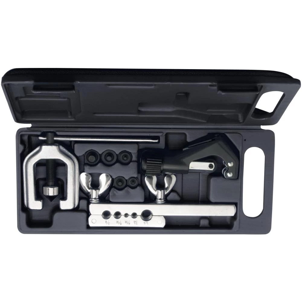 Kraveværktøjssæt til kobber- og letmetalrør. Indhold: spindel, bjælke, rørskærer og diverse afstands- og trykstykker. Dobbelt konisk adapter: 3/16″, 1/4″, 5/16″, 3/8″ og 1/2″.
