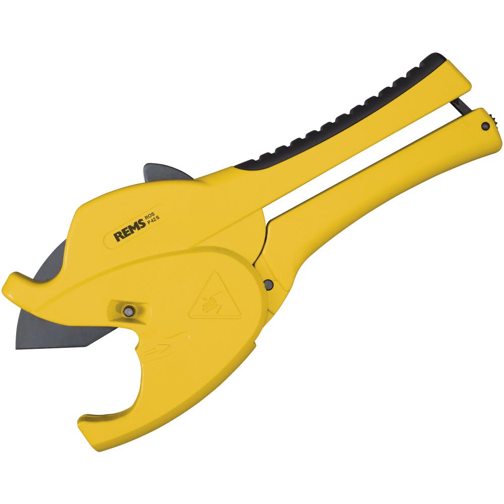 Rems ROS plastrørsaks med ekspres returløb. Brugervenlige kvalitetsværktøjer til ren, hurtig overskæring. Også til tyndvæggede rør. Stabil udførelse i aluminium. Udskiftelig, specialhærdet kileformet klinge, også til tyndvæggede rør. Til enhåndsbetjening. Nem hurtigarbejdende skralde. Vinkelret, gratfrit snit pga dobbelt anlægsflade og præcis dobbeltført klinge. Skæring uden spåner, så ingen spåner ligger tilbage i røret. Fås i flere varianter.