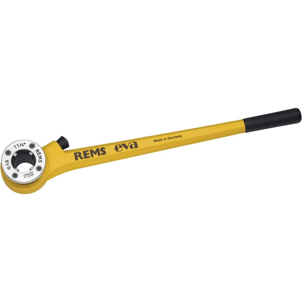 Rems EVA Kluppen til fagfolk. Særlig let påbegyndelse af skæring og gevindskæring. Skralde af stål, beklædt med tykt lag plast. Kun en slags lynudskiftelige skærehoveder.