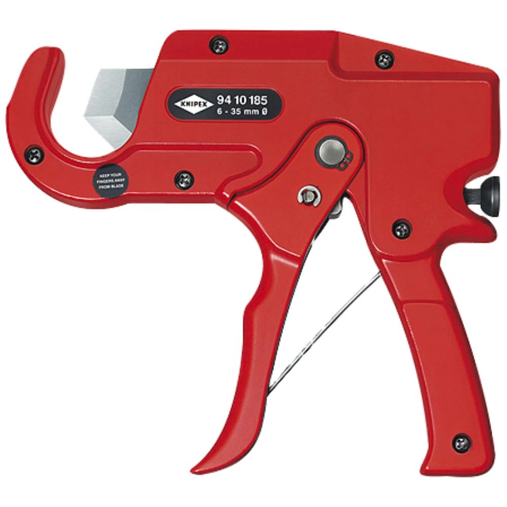 Rørskærer til kunststofrør (El-installation) 185 mm. Til gratfri skæring af kunststofrør (f.eks. kunststof-panzerrør) med Ø6-35 mm. Uegnet til at skære kabler. Kniven kan udskiftes og hentes tilbage fra enhver position. Kun lille opbydelse af kraft på grund af speciel skærgeometri og optimal udveksling. Arbejder næsten uden udmattelse pga. grebets ergonomiske udformning og knivens trinvise fremføring. Hus i trykstøbt aluminium, rødlakeret. Kniv i special-værktøjsstål, oliehærdet.