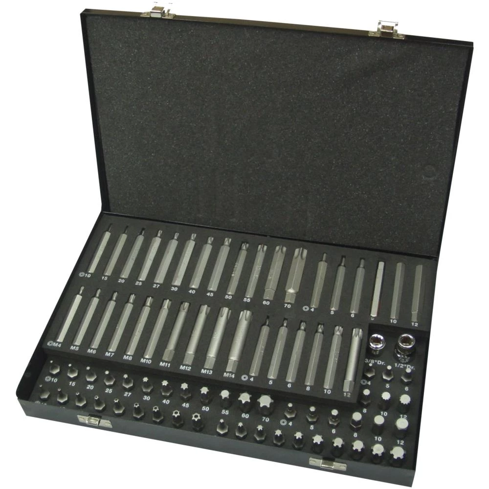 Auto-bitssæt med 81 dele. Sættet indeholder 10 mm 3/8″ korte bits 6kt 4-5-6-7-8-9-10-12 mm, lange bits 6kt 4-5-6-7-8-10-12 mm, korte bits Torx TX10-15-20-25-27-30-40-45-50-55-60-70, lange bits Torx TX10-15-20-25-27-30-40-45-50-55-60-70, korte bits Torx med hul 10-15-20-25-27-30-40-45-50, korte bits XZN M4-5-6-8-10-12, lange bits XZN M4-5-6-8-10-12 samt bitsadapter 3/8″ × 10 mm og 1/2″ × 10 mm. Leveres i metalboks.