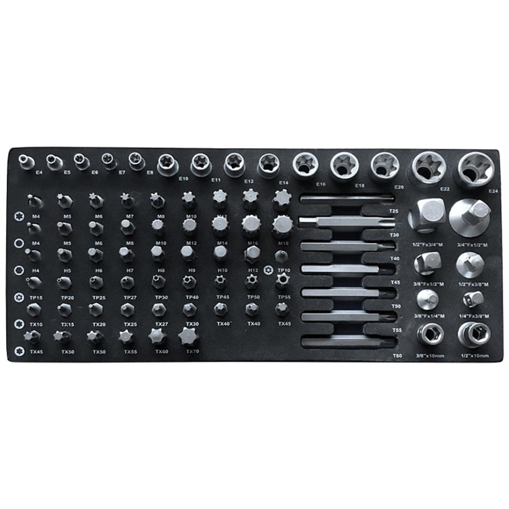 Autobits-/E-toppesæt med 74 dele i EVA-skumindlæg klar til værktøjsvognsskuffe. Sættet indeholder autobits/E-toppe samt adapter. Skumindlægget fylder 1/3 skuffe i Bato værktøjsvogn.