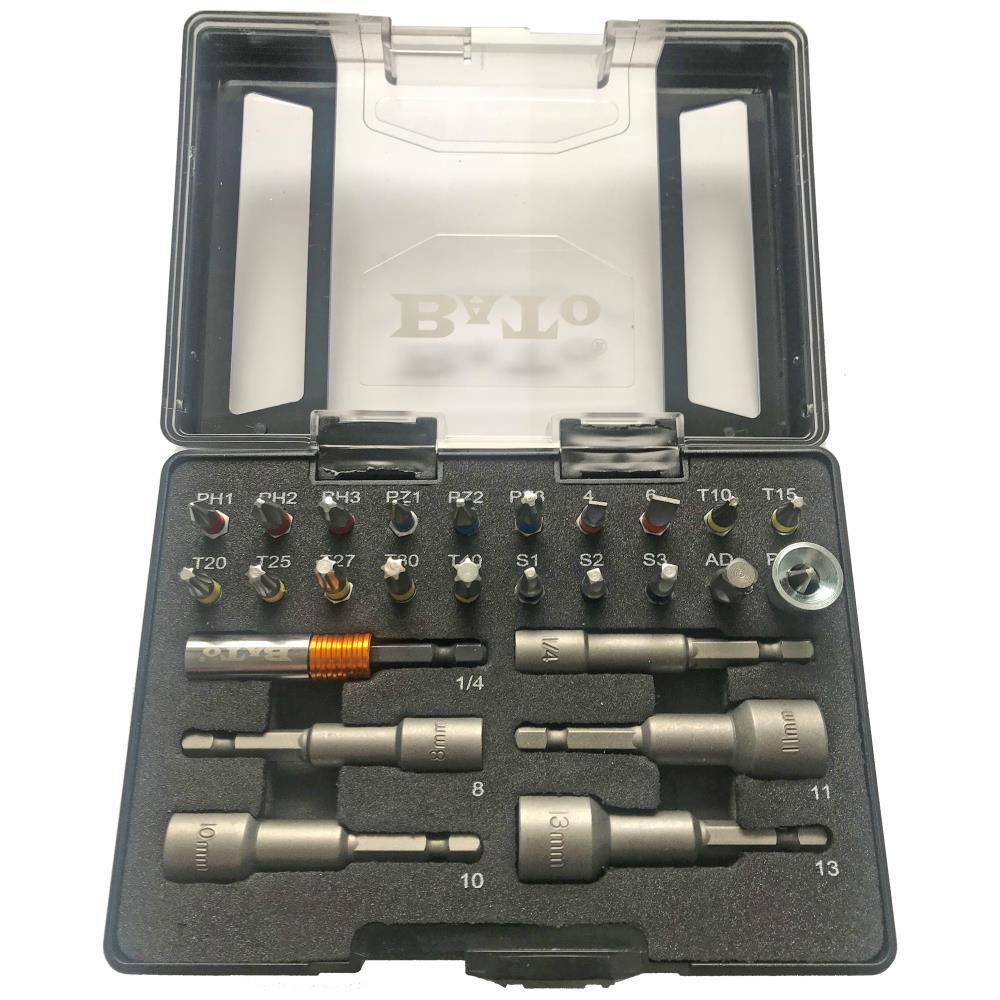 Boltbits kombisæt med 26 dele. Indeholder: PH1-2-3, PZ1-2-3, kærv 4-6 mm, Torx TX10-15-20-25-27-30-40, Robinson 1-2-3, adapter 1/4″×1/4″, PH2 gipsbits, boltbits med magnet 1/4″-8-10-11-13 mm og QuickLock bitsholder. Leveres i plastboks.
