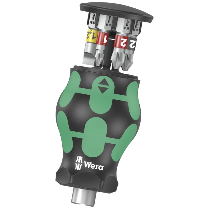 Kort kompakt Stubby-skruetrækker til arbejde under snævre forhold med 6 bits i integreret magasin. Stærk magnet i bitoptaget sikrer bittens placering. 2-komponent Kraftform greb med praktisk kombination af hårde og bløde zoner giver mulighed for at tage ordentligt fat og arbejde præcist. Take it easy værktøjsfinder med farvemærkning og påstemplet størrelse gør det lettere at finde den rigtige bit. Bits: 0,8×5,5×25 mm / 1,2×6,5×25 mm / PH1×25 mm / PH2×25 mm / PZ1×25 mm / PZ2×25 mm.