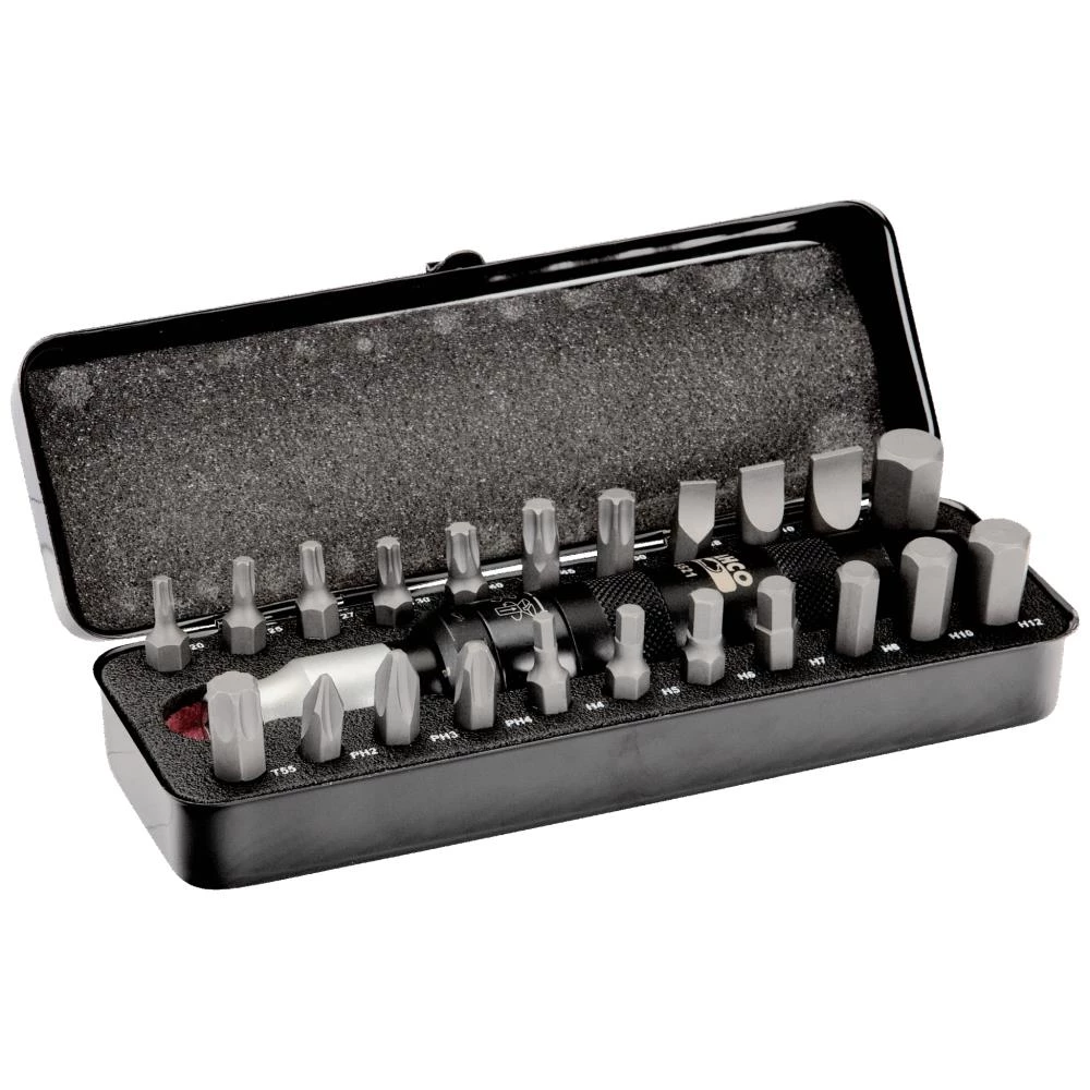 5/16″ bitssæt med 23 dele (21 bits, 1 slagskruetrækker og 1 bitsholder) til slagskruetrækker til ligekærv-, Phillips- og Torx-skruer. Slagskruetrækker til 5/16″ bits. 1/2″ adapter til bits 5/16″ udvendig sekskant. Robuste bits til løsning af fastklemte skruer eller møtrikker uden brug af elværktøj. Højtlegeret stål. Bits: ligekærv 1,2×8,0×41 mm, 1,6×10×41 mm, 2,0×12×41 mm, Phillips PH2, PH3, PH4, Torx T20, T25, T27, T30 og T40. Leveres i metalboks.