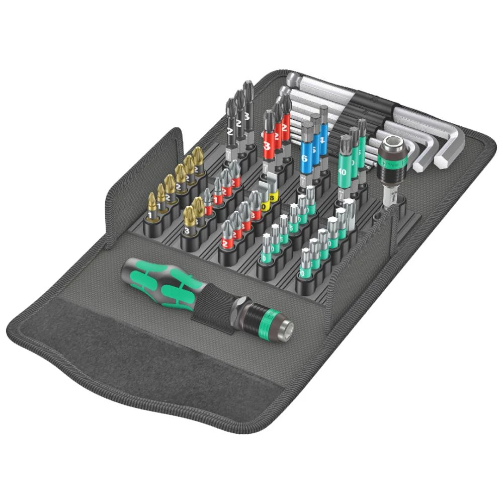 52 dele i overfladeskånende kompakt tekstilboks med høj grad af robusthed. Ringe volumen og vægt letter mobiliteten. Kompakt værktøjssæt med 52 stykker skrueværktøj. 1 stk. bit-håndgreb Rapidaptor med hurtigskift, 1 stk. B bitholder Rapidaptor med hurtigskift til i sætning i skruemaskine eller til brug i borepatronen på en elektronisk boremaskine, 30 stk. BiTorsion bits med 25 mm længde til lang levetid, hårde og slidstærke (BTZ), til universelt brug, ekstrahårde (BTH), 12 stk. Impaktor-bits med 50 mm længde til særlige store krav, 8 stk. vinkelnøgler med Hex-Plus profil (hindrer at indvendige 6kt-skruer drejes runde) og 6kt-kuglehoved på den lange arm til arbejde i vinkel, tekstilboks med meget høj robusthed og lang levetid, kan stilles opretstående med henblik på mere overskuelig lagring i værkstedsreolen. Yderligere overfladebeskyttelse via ydre tekstilbeklædning.