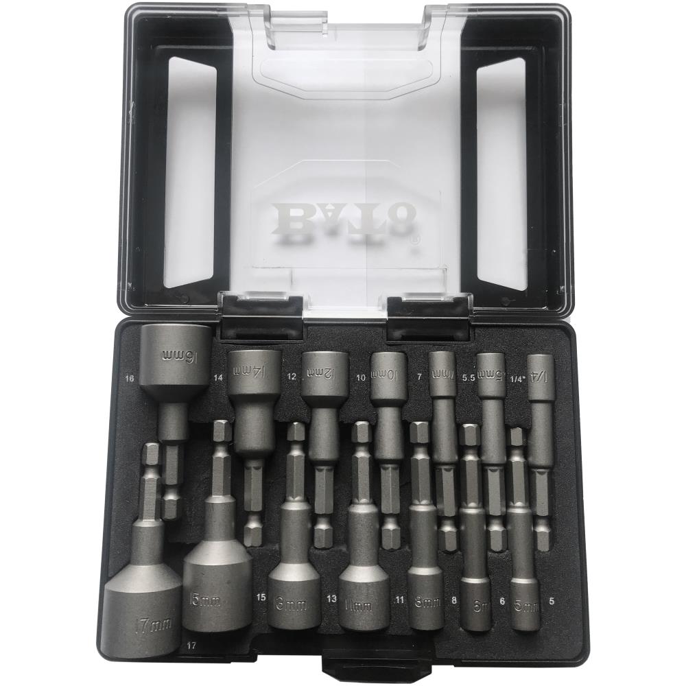 Boltbitssæt med 14 dele. Indeholder 65 mm lange 1/4″ boltbits med magnettoppe: 5,0 – 5,5 – 6,0 – 7,0 – 8,0 – 10,0 – 11,0 – 12,0 – 13,0 – 14,0 – 15,0 – 16,0 – 17,0 mm. Leveres i plastboks.