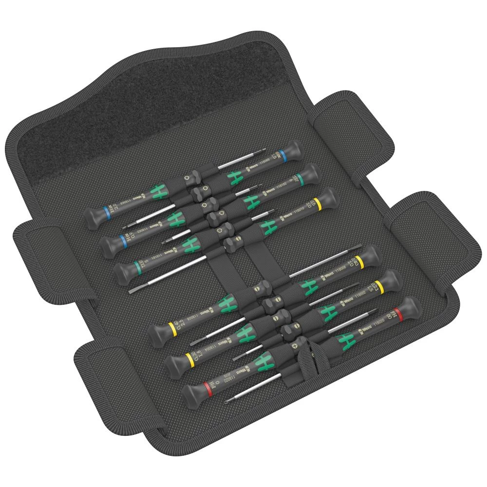 Kraftform Micro elektronik-skruetrækkersæt med 12 dele – til Phillips, Torx, ligekærv og inhex-skruer. Flerkomponent Kraftform Micro greb med præcisionszone direkte ovenfor klingen, kraftzone med integrerede bløde zoner for overførsel af store løsnings- og spændingsmomenter, og hurtigdrejezone nedenfor den drejelige kappe for lynhurtig snurren rundt. Black Point spids garanterer lang brugstid for spidsen, forøget korrosionsbeskyttelse og eksakt pasform. “Take it easy”-værktøjsfinder: Farvemærkning efter profiler og størrelse. Sekskantet rullestop forhindrer skruetrækkeren i at rulle væk på arbejdsstedet. Sættet indeholder: Phillips: PH00 × 60 mm / PH0 × 60 mm, Torx med holdefunktion: TX5 × 40 mm / TX6 × 40 mm, ligekærv: 0,23 × 1,5 × 40 mm / 0,3 × 1,8 × 60 mm / 0,4 × 2 × 60 mm / 0,4 × 2,5 × 80 mm / 0,5 × 3 × 80 mm, inhex: 0,9 × 40 mm / 1,5 × 60 mm / 2 × 60 mm. Leveres i praktisk og robust foldetaske.