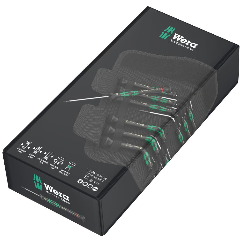 Kraftform Micro elektronik-skruetrækkersæt med 12 dele – til Phillips, Torx, ligekærv og inhex-skruer. Flerkomponent Kraftform Micro greb med præcisionszone direkte ovenfor klingen, kraftzone med integrerede bløde zoner for overførsel af store løsnings- og spændingsmomenter, og hurtigdrejezone nedenfor den drejelige kappe for lynhurtig snurren rundt. Black Point spids garanterer lang brugstid for spidsen, forøget korrosionsbeskyttelse og eksakt pasform. “Take it easy”-værktøjsfinder: Farvemærkning efter profiler og størrelse. Sekskantet rullestop forhindrer skruetrækkeren i at rulle væk på arbejdsstedet. Sættet indeholder: Phillips: PH00 × 60 mm / PH0 × 60 mm, Torx med holdefunktion: TX5 × 40 mm / TX6 × 40 mm, ligekærv: 0,23 × 1,5 × 40 mm / 0,3 × 1,8 × 60 mm / 0,4 × 2 × 60 mm / 0,4 × 2,5 × 80 mm / 0,5 × 3 × 80 mm, inhex: 0,9 × 40 mm / 1,5 × 60 mm / 2 × 60 mm. Leveres i praktisk og robust foldetaske.