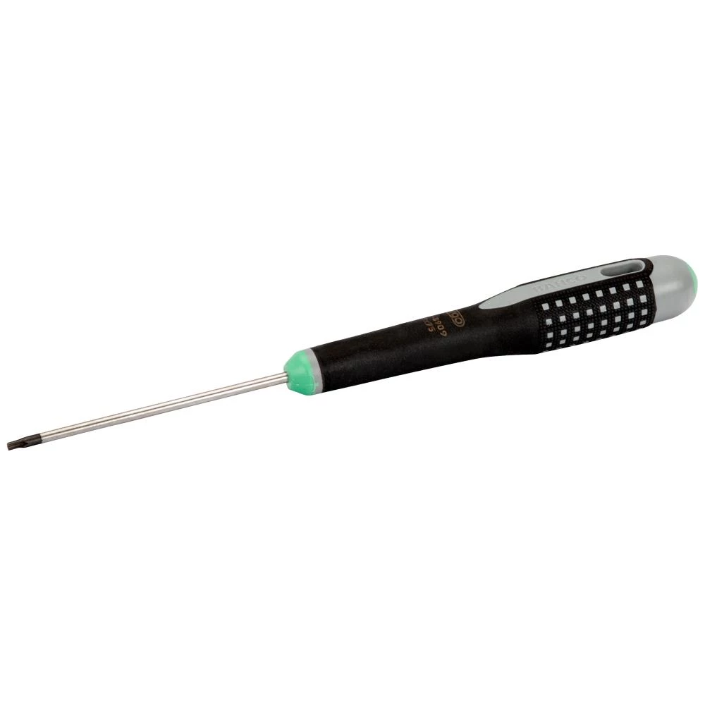 Ergo skruetrækker til Torxskruer. Højtlegeret stålklinge, forkromet og helhærdet. Fosfateret spids for større nøjagtighed. 3-komponent håndtag i blødt materiale med nubret overflade giver et godt greb og højere vridmoment. Forsynet med ophængshul. Nemt at vælge den rette spids med det farvekodede skaft og permanent symbol i den kugleformede ende (ingen farveidentifikation på de ekstra små håndtag i størrelse T4, T5, T6, T7, T8 og T9). Fås i flere størrelser.