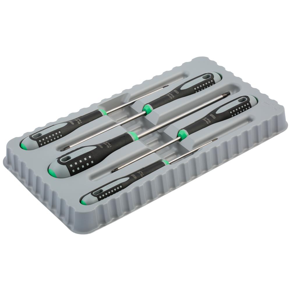 Ergo skruetrækkersæt med 5 dele til Torx. Skruetrækkere med fosfateret spids og højtlegeret stålklinge, forkromet og helhærdet. 3-komponent håndtag af blødt materiale med nubret overflade for et godt greb og højere vridmoment. Asymmetrisk design sikrer skruetrækkeren fra at rulle væk fra arbejdsstedet. Nemt at vælge den rette spids med det farvekodede skaft og permanent symbol i den kugleformede ende. Sættet indeholder: T10 / T15 / T20 / T25 / T30. Leveres i papæske.