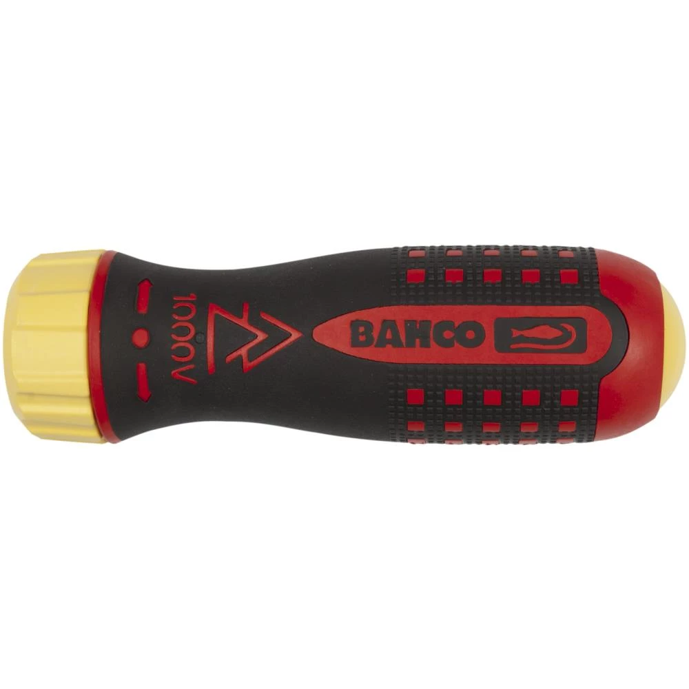 1000V skruetrækkerhåndtag til udskiftelige klinger. To-komponent håndtag med friktionsmateriale og nubret overflade. Skraldefunktion med 48 tænder. Robust omskifter til højre-/venstreløb. Til arbejde på emner med op til 1000V. Sikker fjernelse af klinger via trykfunktion i toppen af håndtaget. Der findes et bredt program af isolerede klinger til dette håndtag: Ligekærv, PH, PZ, TORX og Combi PH/PZ. Håndtaget kan kun bruges sammen med klinger (xxxxSL-2P). Detailforpakning: Transparent plastrør (PVC) med ophængshul.
