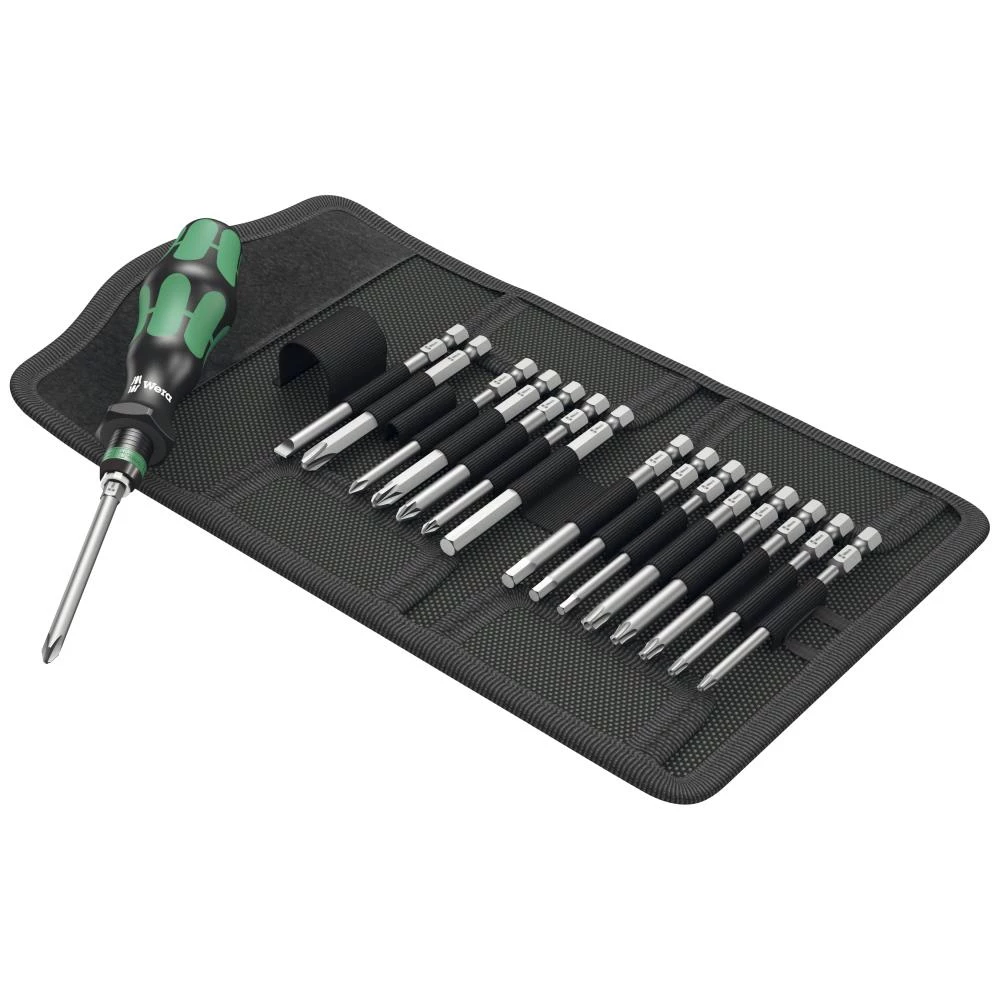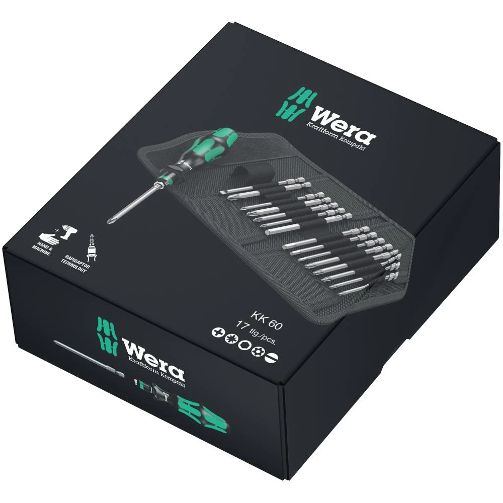 Kraftform Kompakt sæt med 17 dele – udskiftningsklinger og håndgreb. Greb/udskiftningsklinge-systemet tillader lynhurtig udskiftning af den påkrævede klinge og giver dermed mangfoldige anvendelsesmuligheder. Kraftform grebet giver mulighed for stor kraftoverførsel via de skridsikre bløde områder og høj arbejdshastighed via de hårde områder på grebet. Sekskantet rullestop forhindrer at værktøjet ruller væk på arbejdsstedet. Sættet indeholder klinger i længden 89 mm for: Phillips: PH1 / PH2 / PH3, Pozidriv: PZ1 / PZ2 / PZ3, Torx med boring: TX10 / TX15 / TX20 / TX25 / TX30, ligekærv: 1 × 5,5 mm, Hex-Plus: 3 mm / 4 mm / 5 mm / 6 mm. Derudover: Kraftform Kompakt håndgreb. Leveres i robust foldetaske.