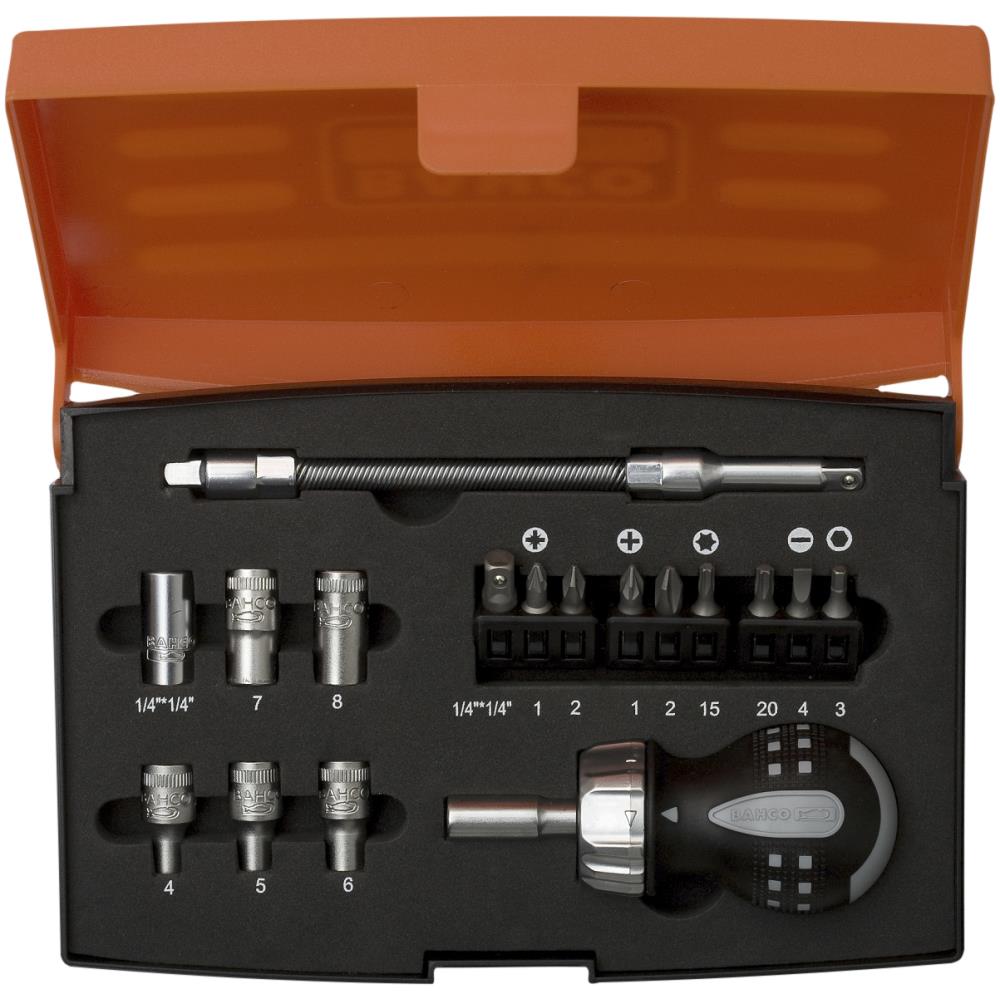 Stubby skraldeskruetrækkersæt med 18 dele. Tokomponent håndtag og robust omskifter til højre-/venstreløb. Inkl. diverse værktøjer og bits. Indeholder: 1 stk. stubby skraldeskruetrækker med aftagelig klinge, 8 stk. S2 fosfateret bits: PH1, PH2, PZ1, PZ2, T15, T20, SL4 og HEX3, 1 stk. 1/4″×1/4″ top-adaptor, 1 stk. 1/4″ 50 mm bitsadaptor, 1 stk. 1/4″ fleksibel forlænger 150 mm, 1 stk. 1/4″×1/4″ bitsadaptor, 5 stk. toppe: 4, 5, 6, 7, 8 mm.