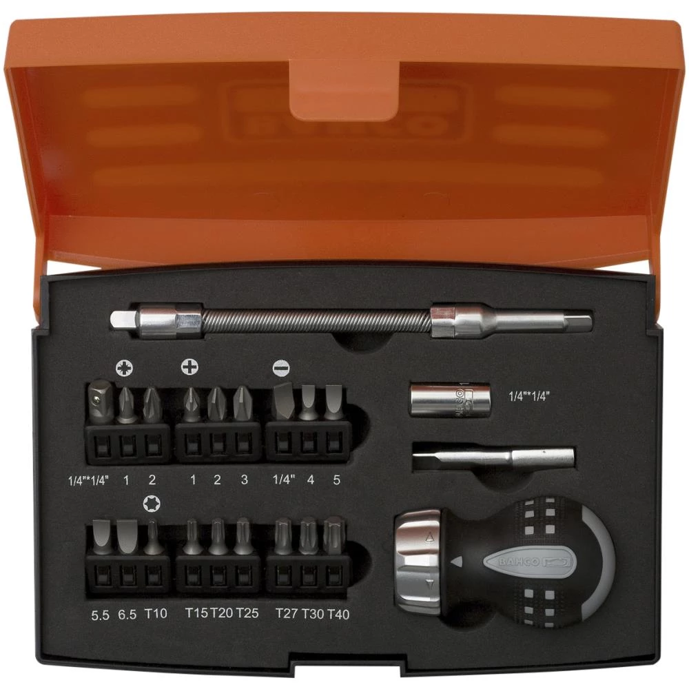 Stubby skraldeskruetrækkersæt med 22 dele. Tokomponent håndtag og robust omskifter til højre-/venstreløb. Inkl. diverse værktøjer og bits. Indeholder: 1 stk. stubby skraldeskruetrækker med aftagelig klinge, 17 stk. S2 fosfateret bits: PH1, PH2, PH3, PZ1, PZ2 T10, T15, T20, T25, T27, T30, T40, SL4, SL5, SL5,5, SL6,5, SL1/4″, 1 stk. 1/4″ top-adaptor, 1 stk. 1/4″ 50 mm bitsadaptor, 1 stk. 1/4″ fleksibel forlænger 150 mm, 1 stk. 1/4″×1/4″ bitsadaptor.